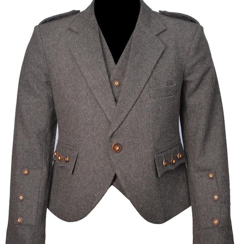 Scottish Brown Tweed Argyle Kilt Jacket With Waistcoat/Vest - Sizes 36"- 54"